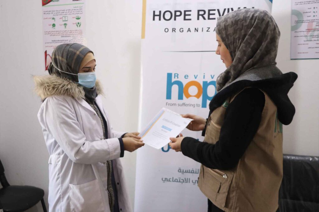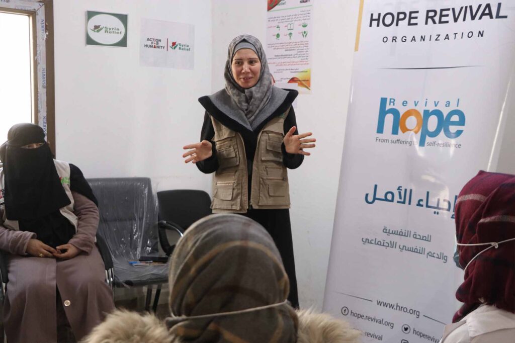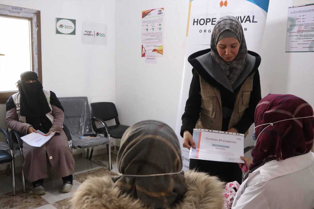 Within the Safe Spaces for Women and Girls project in Al Hamama and Foz-Zuf areas in Jisr Ash Shugur countryside, the HRO teams implemented the Amal Initiative program, which aims to activate the capacities of adolescent girls in fragile contexts and provide them with reproductive health services, taking into account their healthcare needs and the specific barriers they encounter while accessing such services in health facilities, in addition to raising the community awareness, rectifying the misconceptions towards their issues.